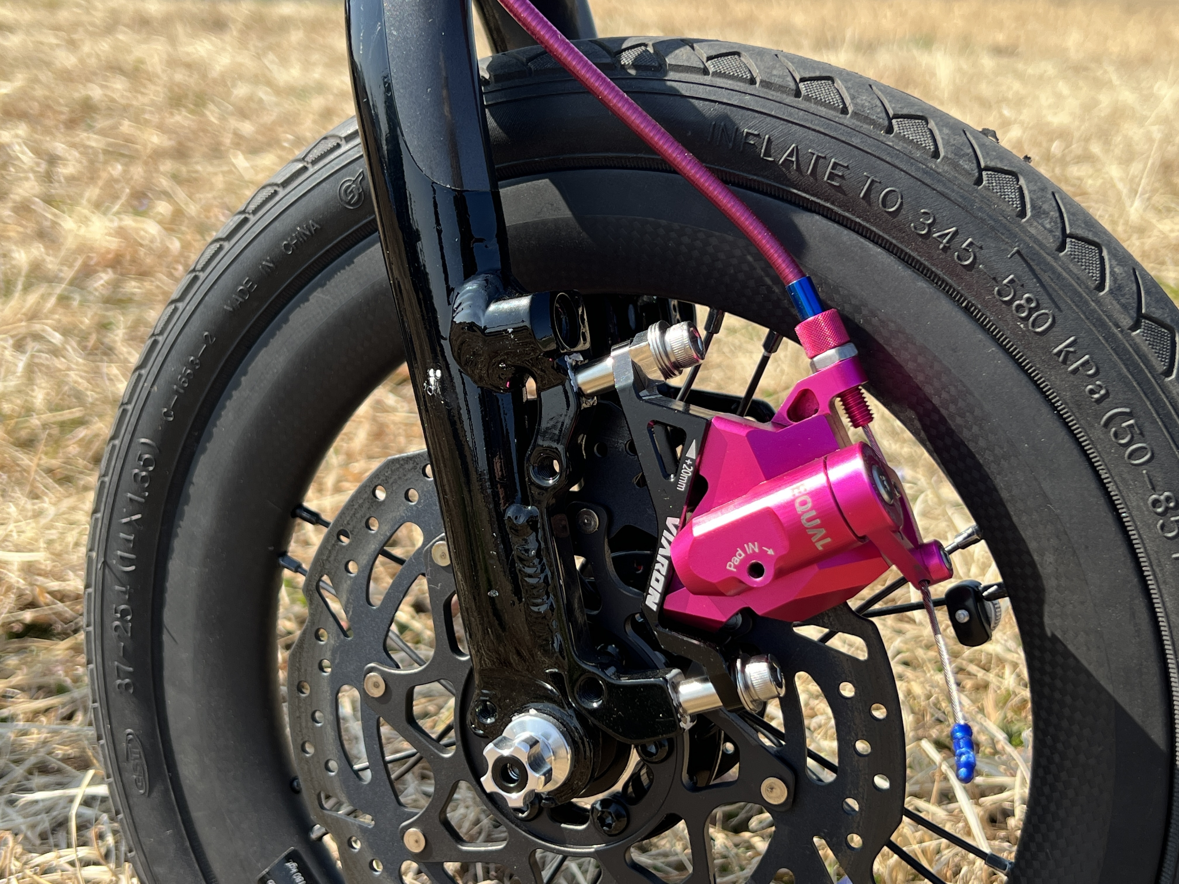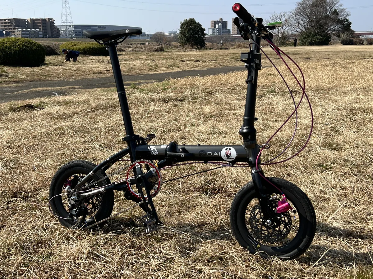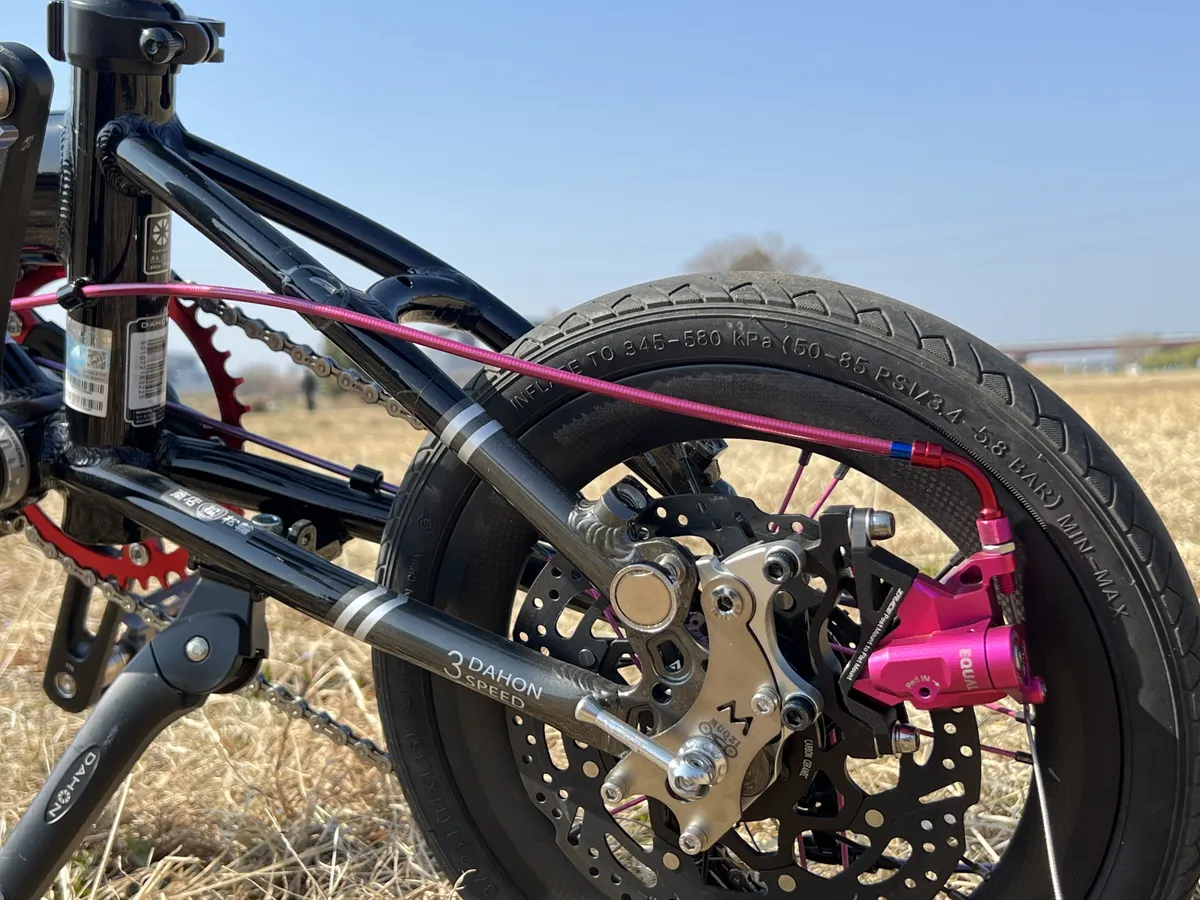同じ趣味のラジコンから知り合った友人Hさん(通称:ライトさん)が見せてくれた小径車のDAHONには、燦然と輝くピンク色のEQUALキャリパーの存在感が圧倒的!
