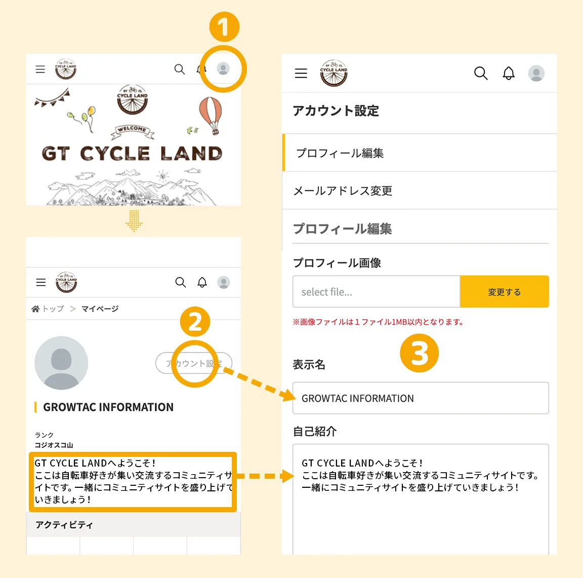 ❶ 画面右上のアイコン (画像登録前はシルエットで表示) を押下で 「マイページ」 へ ❷ 「アカウント設定」 を押下し設定画面へ ❸ 画面を下にスクロールして 「プロフィール編集」 欄を更新しましょう!